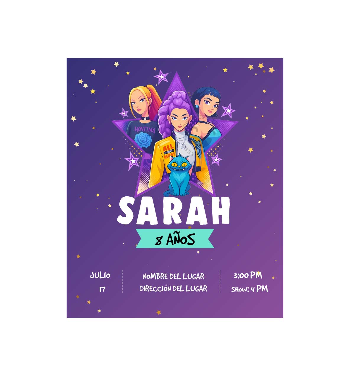 Invitación Guerreras kpop Stars. Incluye: 1 invitación digital y 1 archivo opcional  para imprimir (PDF). Se entrega sin marca de agua.